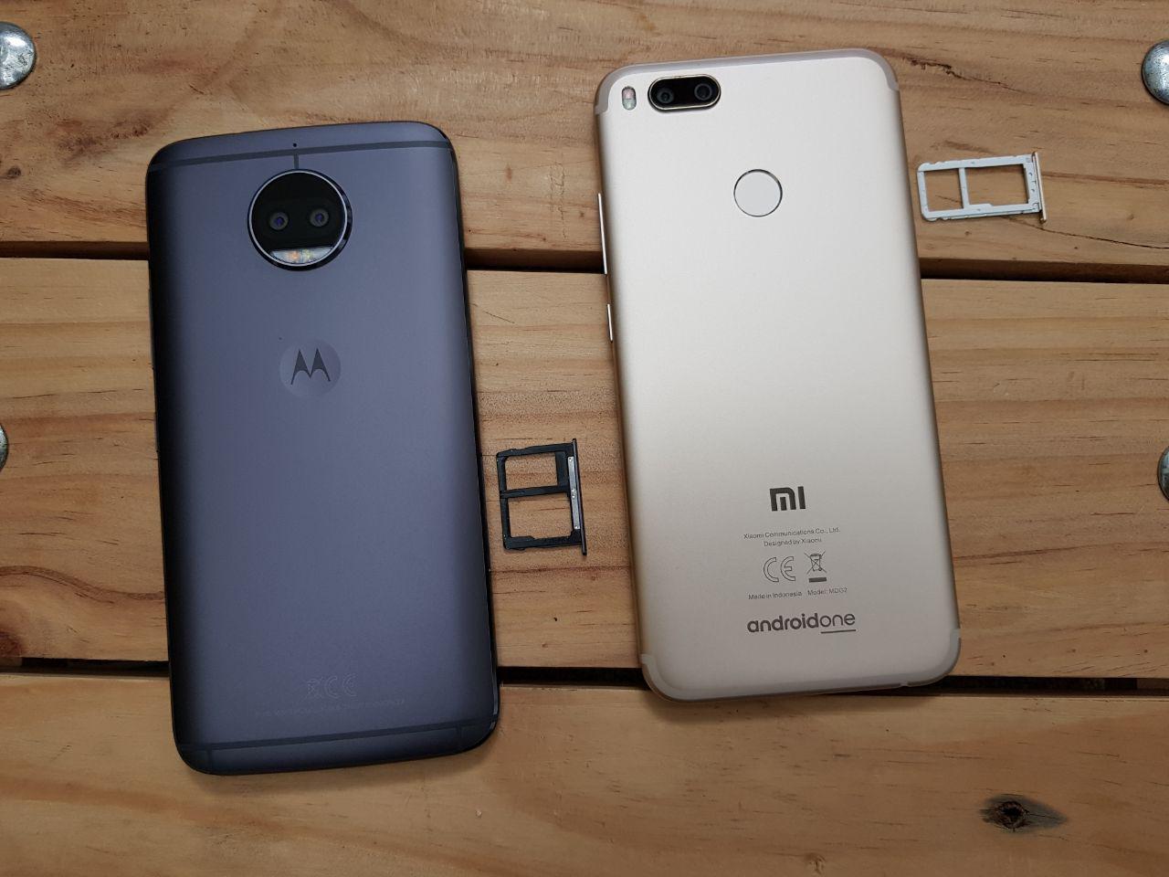 Pada bagian atas Mi A1 memiliki lubang infra red untuk remote control yang tidak dimiliki G5S Plus. Pada sisi kiri, keduanya meletakkan SIM tray hybrid, bisa memilih apakah akan menggunakan dual SIM atau single SIM dengan tambahan memori eksternal.