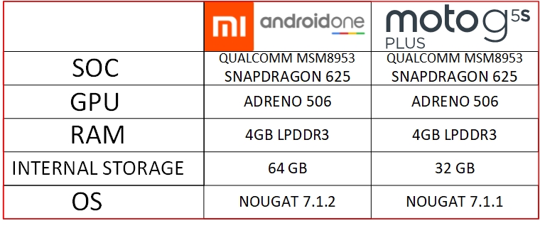 Kedua smartphone sama-sama menggunakan prosesor yang sama, Qualcomm Snapdragon 625 dan besaran RAM yang sama 4GB LPDDR3. Dengan hardware yang sama, secara kinerja harusnya keduanya mirip, tinggal ditentukan dari sisi software dan kernel. Secara software sendiri OS yang digunakan sama Nougat dan keduanya bisa dikatakan stock Android atau Android pure, walau ada sedikit penambahan menu/fitur, tetapi lebih sebagai aplikasi tambahan.