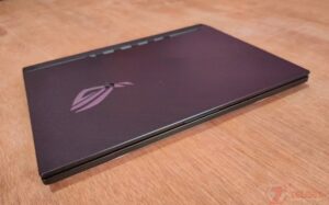 Laptop gaming ini tampak memiliki kesan tebal dan tegas, dengan setiap lekukan dan kontur garis pada body. Akan tetapi perangkat ini tetapi membawa layar dengan bezel yang tipis.