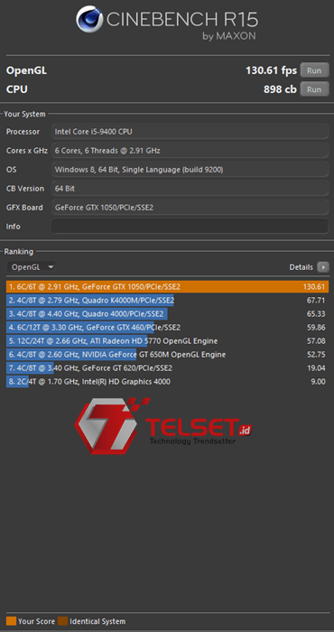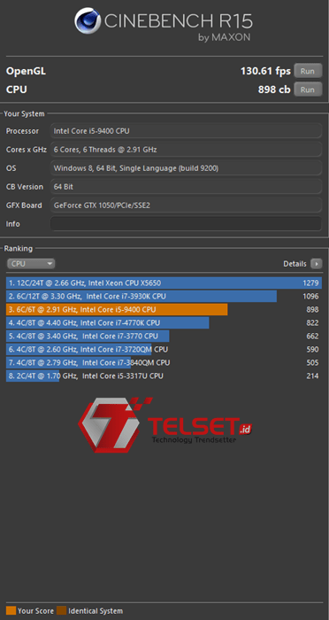 Ke empat aplikasi tadi adalah, Cinebench R15, 3DMark, PCMark, dan CrystalDiskMark. Berikut rincian grafik dan screenshot hasil benchmark yang kami lakukan: