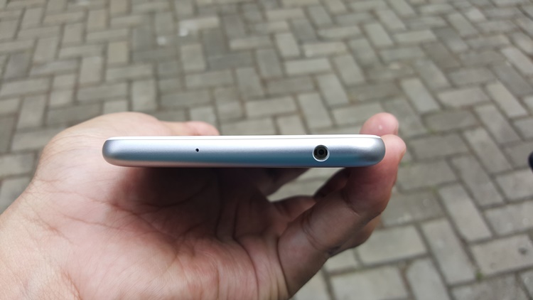 Ke bagian sisi atas, terdapat sesuatu hal yang cukup berbeda di sini. Karena terdapat jack 3.5 mm di bagian atas tersebut. Padahal biasanya jack 3.5 mm ditemukan di bagian bawah smartphone. Nah untuk bagian bawahnya, terdapat mic, microUSB yang sudah mendukung OTG, serta speaker phone yang letaknya mirip seperti beberapa smartphone lain di kelasnya.