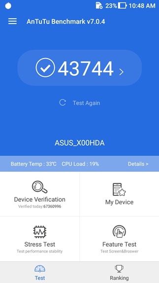 Berbicara soal kinerjanya, kami pertama kali menggunakan aplikasi AnTuTu Benchmark terlebih dahulu. Dari hasil test yang dilakukan, ZenFone 4 Selfie Lite mampu meraih skor 43.744 poin. Dibandingkan dengan benchmark Asus ZenFone 4 Selfie, skor versi Lite masih tertinggal beberapa ratus poin saja karena versi ZenFone Selfie standar mencatatkan skor 44.035 poin.