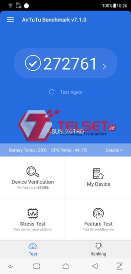 Hal ini kami buktikan melalui pengujian menggunakan aplikasi benchmark, AnTuTu Benchmark versi 7. Berdasarkan tes yang kami lakukan, Asus Zenfone 5Z mampu mencetak skor 272.761 poin, dan itu merupakan skor yang sangat tinggi untuk sebuah smartphone di bawah Rp 8 jutaan.