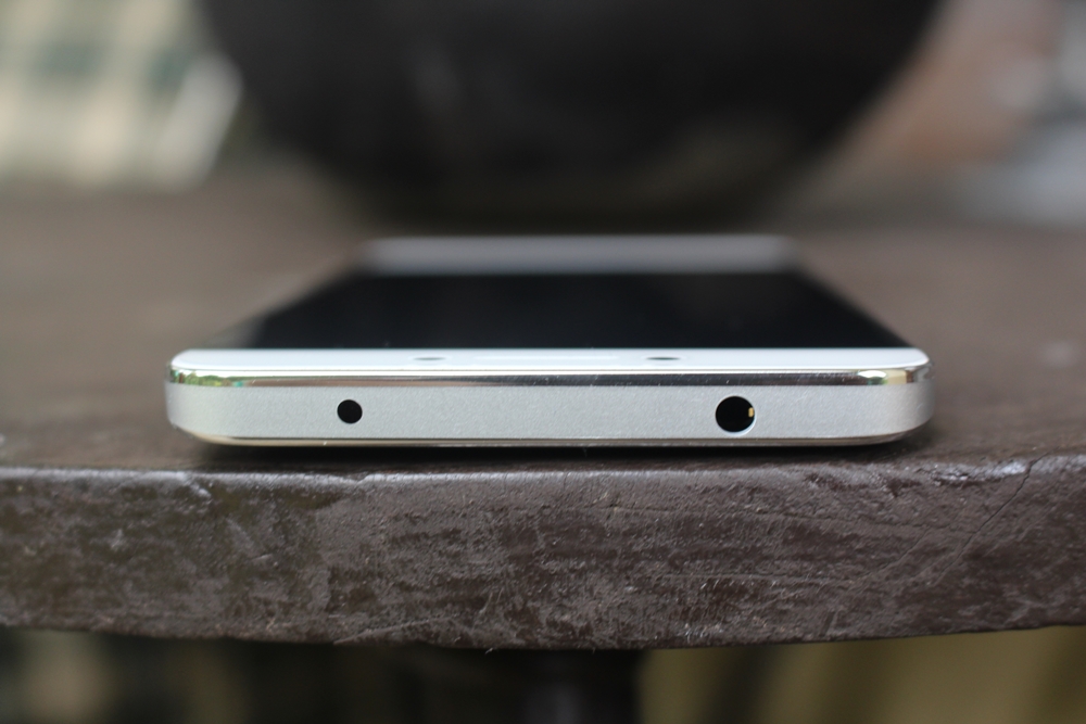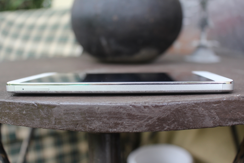 Di bagian depan, terdapat layar berukuran 5.5 inch yang kurang lebih menghabiskan ruang hingga 73%. Tepat di bawahnya, ada tiga tombol kapasitif tersembunyi yang bertugas sebagai Recent Apps, Home dan juga Back. Yang menarik dari tiga tombol kapasitif ini adalah, jika tombol tersebut tidak digunakan atau disentuh, ponsel ini terlihat sama sekali tidak memiliki tombol di bagian depannya. Sedangkan di bagian atasnya terdapat kamera berukuran 8MP, earpiece, sensor proximity dan juga LED notifikasi.