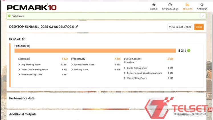 Dalam pengujian benchmark, Latitude 7350 menunjukkan kinerja yang kompetitif di segmen laptop bisnis, dengan hasil yang cukup baik pada subtes Essentials dan Productivity.