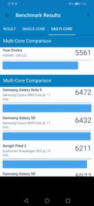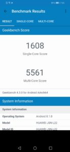 Di aplikasi benchmark Geekbench skor yang diperoleh 5561 poin, yang jauh lebih tinggi dari skor Moto G6 Plus yang hanya 4,167. Honor 8X memiliki RAM 4GB sedangkan ROM 128GB. Sedangkan untuk Bechmark Antutu Honor 8X memiliki skor 138402.