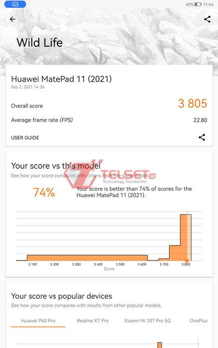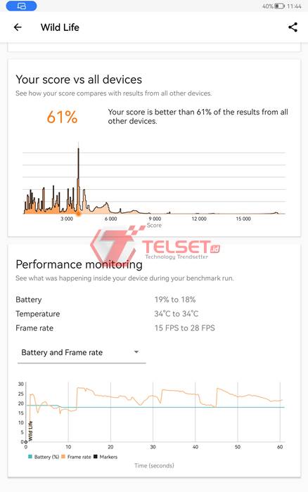 Untuk pengujian GPU dalam hal ini Adreno 650, Huawei MatePad 11 (versi Indonesia) meraih skor yang tinggi di seluruh aspek review yang kami gunakan. Dari tes Wild Life, tablet ini meraih skor 3.805 poin dengan rata-rata frame rate 22,8 FPS.