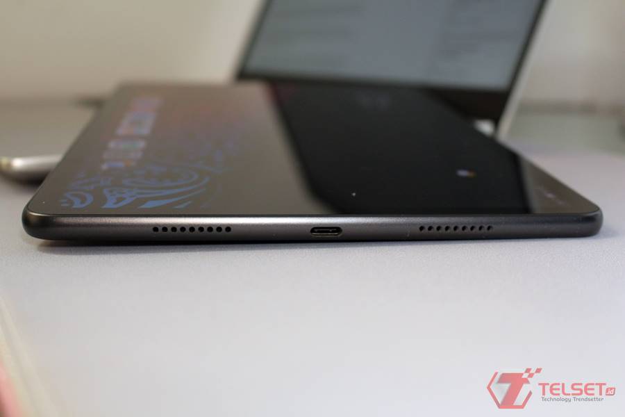 Tablet ini mempunyai empat speaker, dua speaker ditaruh di kiri dan dua sisanya di sebelah kanan. Jujur, kami menyukai tata letak tombol, slot microSD, speaker, dan port USB-C dari tablet ini. Layout-nya pas dan mudah dijangkau.