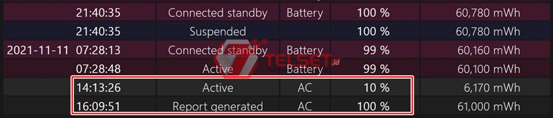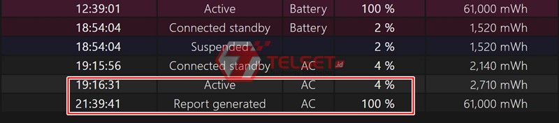 Dari pengujian yang kami lakukan dengan memakainya untuk bekerja sambil memutar musik, melakukan rapat online via Zoom, dan sesekali streaming Netflix, tercatat laptop ini bisa bertahan dengan durasi rata-rata 6 jam sampai 6 jam 45 menit. Catatan waktu ini kami dapatkan dari aplikasi Battery Log bawaan dengan mengakses CMD.