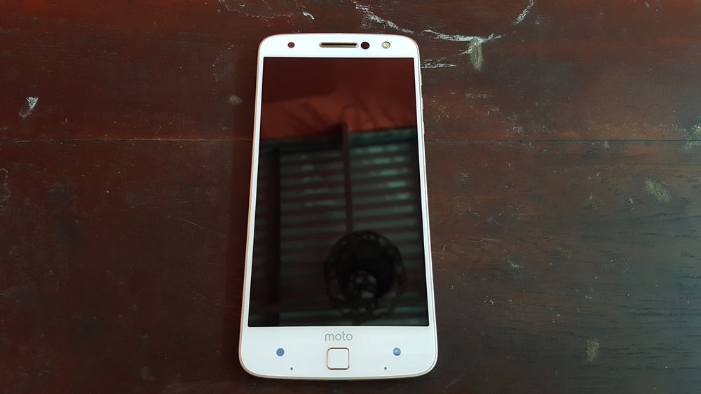 Di bagian depan, terlihat Moto Z begitu banyak sekali ornamen yang terlihat mengelilingi layar berukuran 5.5 inch di Moto Z. Misalnya saja di bagian bawahnya yang terdapat sensor sidik jari yang diapit oleh sensor jarak yang memungkinkan tangan pengguna untuk menyalakan layar smartphone dengan menempatkan layar di atas smartphone saja.