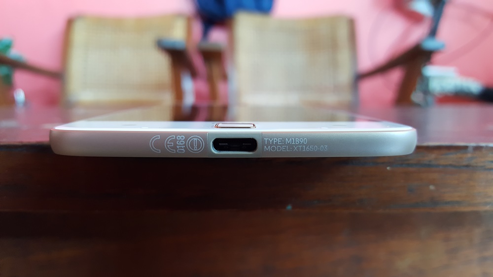 Sementara itu di bagian atasnya, terdapat speaker yang diapit oleh sensor proximity di sebelah kiri dan kamera berukuran 5MP serta LED Flash yang berada di sebelah kanan. Tentu Anda akan heran kenapa Lenovo berani menempatkan speaker di bagian atas. Jawabannya mungkin adalah karena body Moto Z yang tipis yang menjadikan mereka “nekat” menempatkan speaker di tempat yang tidak biasa.