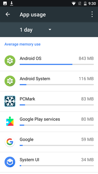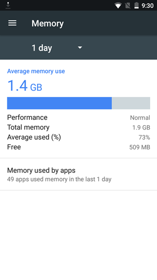 Melihat itu, kami pun membuka pengaturan Memory pada bagian Settings. Dalam penggunaan sehari, ternyata dari RAM 1.9GB yang terdapat pada Nokia 3, semua aplikasi termasuk sistem telah menggerus 73% RAM yang ada atau sekitar 1.4GB. Konsumsi terbanyak ditempati oleh sistem operasi Android yang habiskan sekitar 844MB memori.