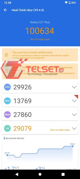 Saya juga mencoba untuk menguji Nokia C21 Plus di AnTuTu Benchmark hasilnya sangat memprihatinkan dengan skor 100.634 Bahkan AnTuTu Benchmark juga memberikan peringatan bahwa hasil skor ini tidak wajar.