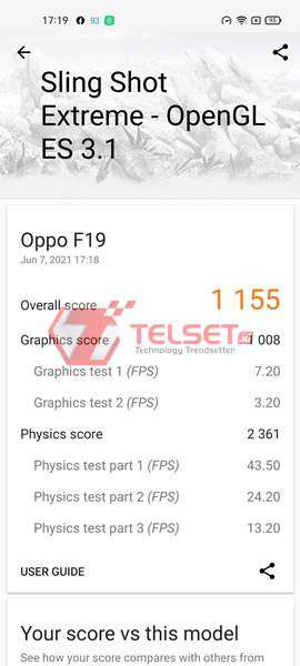Untuk mengetes kemampuannya, kami menggunakan skema Sling Shot dan Sling Shot Extreme di aplikasi 3DMark. Hasilnya, Oppo A74 meraih skor 1.818 poin untuk Sling Shot dan 1.155 poin untuk Sling Shot Extreme.