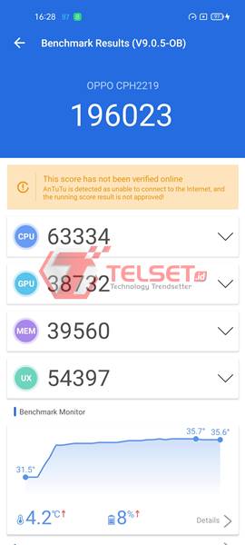 Kami menggunakan aplikasi versi 9 terbaru. Dari pengujian, Oppo A74 memperoleh skor 196 ribuan poin. Skor ini tergolong standar untuk sebuah ponsel 3 jutaan.