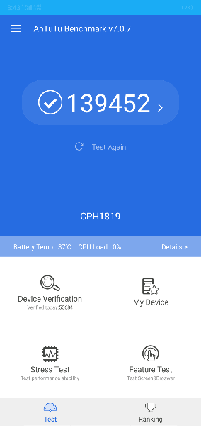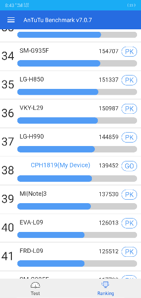 Hasilnya, Oppo F7 mampu meraih skor 139.452 poin di AnTuTu Benchmark. Terbilang sangat tinggi bagi smartphone kelas menengah, bahkan berdasarkan aplikasi itu, skor Oppo F7 hampir menyamai LG V20 yang gunakan prosesor quad-core 2.15GHz Snapdragon 820 dengan skor 144.859 poin.