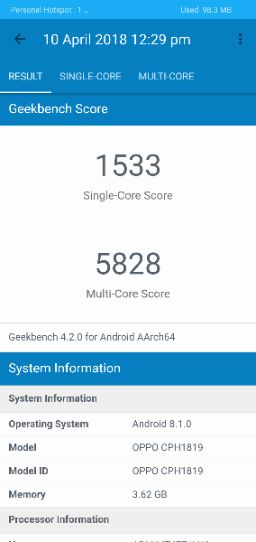 Sementara ketika menggunakan Geekbench, Oppo F7 sukses mencetak skor 1.533 poin untuk pengujian single-core dan 5.828 poin untuk pengujian multi-core.