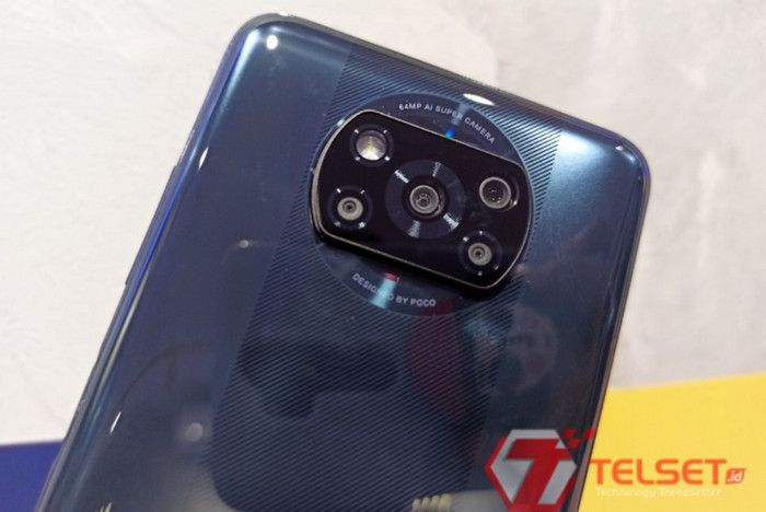 Disekeliling frame tersebut tercetak kalimat melingkar yang bertuliskan “Designed By Poco” dan “64 MP AI Super Camera”, sebagai penanda fitur kamera yang dibawa ponsel ini.