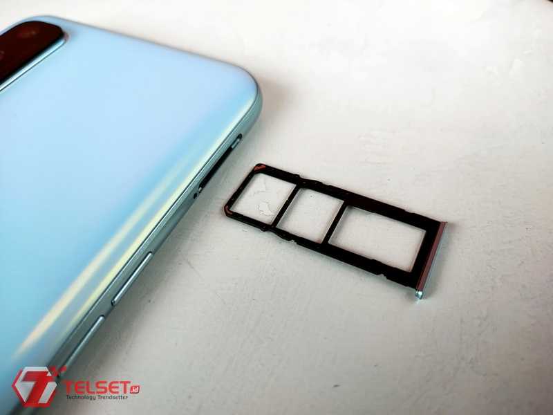 Tapi, warna ini cenderung menampilkan warna biru muda yang cukup terang, mirip langit yang bersih di pagi hari. Dan lagi, terdapat efek dual-tone warna pada body belakang realme 7, warna sebelah kiri dengan space kecil cenderung glossy, dan sebelah kanan lebih matte.