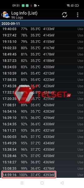 Pengujian berikutnya adalah memutar video YouTube di resolusi Full HD tanpa henti dan mencatatnya menggunakan Battery Log. Berdasarkan pengujian, baterai realme 7 bisa bertahan sampai 18,5 jam dengan baterai tersisa 5%.
