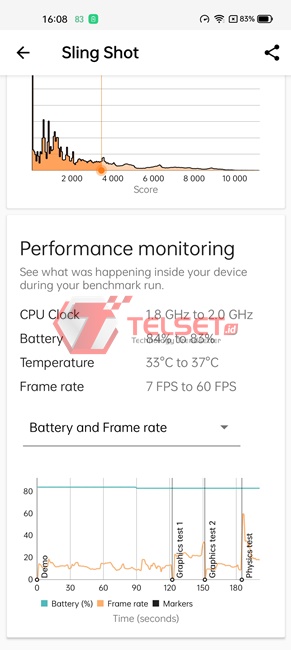 Tes Sling Shot standar, realme 8i yang kami review mendapatkan skor 3.446 poin dengan rata-rate frame rate mencapai 7 sampai 60 FPS. Sementara untuk versi Extreme, skornya mencapai 2.463 poin dengan frame rate rata-rata 5 hingga 60 FPS.