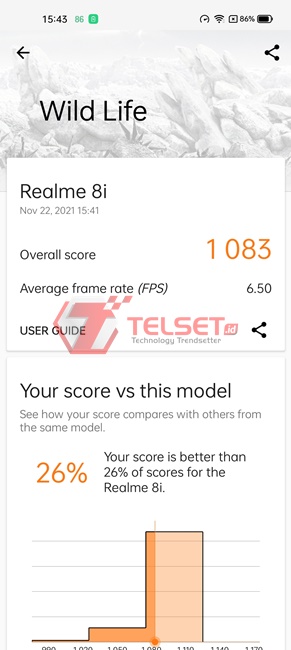 Nilai yang diraih realme 8i hanya berbeda sedikit dibandingkan ponsel dengan spesifikasi Snapdragon 720G yang pernah kami uji dengan rata-rata skor mencapai 340 ribuan poin.