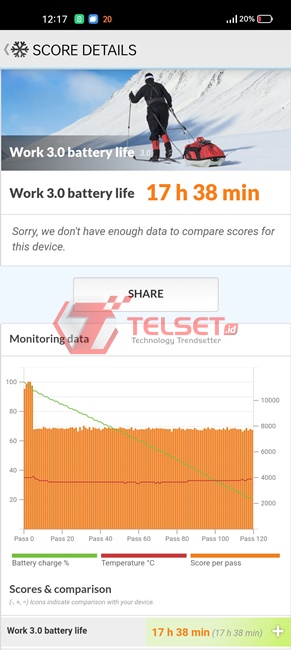 Dari pengujian, smartphone ini mencatatkan skor screen on time selama 17 jam 38 menit! Kasarnya, smartphone ini berarti dapat bertahan sampai seharian untuk pemakaian normal.