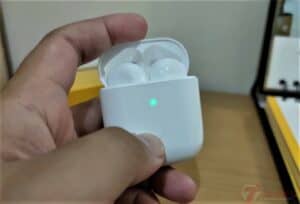 Saat Charging Case dibuka, jika baterai kurang dari 20%, maka lampu indikator LED tesebut akan menyala secara berkedip. Tetapi jika baterai masih diatas 20% maka lampu LED akan menyala terus berwarna hijau.