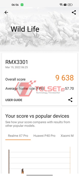 Sementara untuk pengujian kartu grafis, aplikasi 3DMark mengganjar skor yang begitu tinggi untuk smartphone terbaru realme. Pada tes Wild Life, smartphone ini memperoleh nilai 9.638 poin dengan frame rate rata-rata 57,7 FPS.