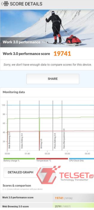 Lanjut ke pengujian PCMark, hasilnya mendapatkan skor 19.741 yang mana ini menunjukan perangkat bisa diandalkan untuk melakukan aplikasi-aplikasi pekerjaaan sehari-hari.