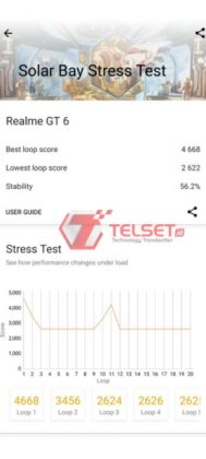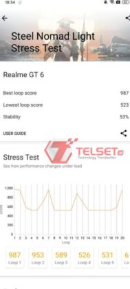 Lanjut di pengujian 3DMark, pengujian Solar Bay Stress Test mendapatkan skor 4.668 dengan tingkat kestabilan 56,2% dan pengujian Steel Nomad Light Stress Test menunjukan hasil yang mirip-mirip dengan skor 987 dan tingkat kestabilan 53%.
