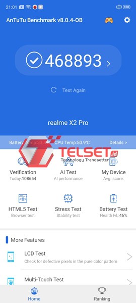 Berdasarkan AnTuTu Benchmark, Realme X2 Pro berhasil mencatatkan skor 468 ribuan! Skor tersebut bahkan lebih tinggi dibandingkan Samsung Galaxy Note 10+ yang kami review sebelumnya dengan skor 432 ribuan.