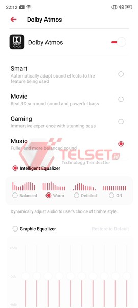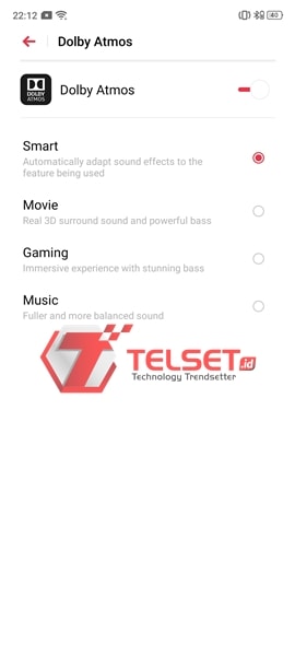 Oh ya, kami menggunakan pengaturan Smart pada Dolby Atmos di smartphone ini. Opsi tersebut memungkinkan sistem untuk menyesuaikan pengaturan suara yang pas, tergantung konten atau musik yang didengarkan.