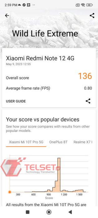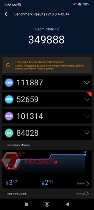 Dalam pengujian AnTuTu Benchmark V10, Redmi Note 12 4G ini berhasil mendapatkan skor sebanyak 349.888 poin. Di segmen harga Rp 2 jutaan, ponsel ini termasuk mendapat skor yang cukup tinggi dalam pengujian ini. Ini juga sejalan dengan kemampuannya dalam menjalankan berbagai aktivitas.
