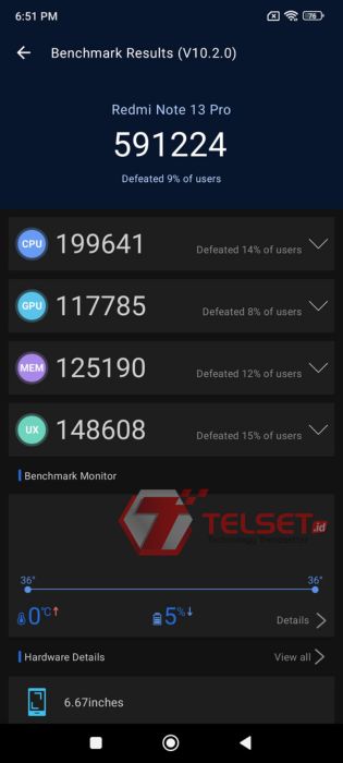 Secara jelas performanya memang sudah termasuk oke, biar lebih jelas lagi pengujian performanya, berikut hasil pengujian sintetis Redmi Note 13 Pro 5G dari beberapa aplikasi: