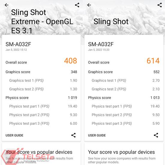 Sedangkan untuk Sling Shot Extreme skor yang didapatkan oleh Samsung Galaxy A03 Core adalah 408 poin.