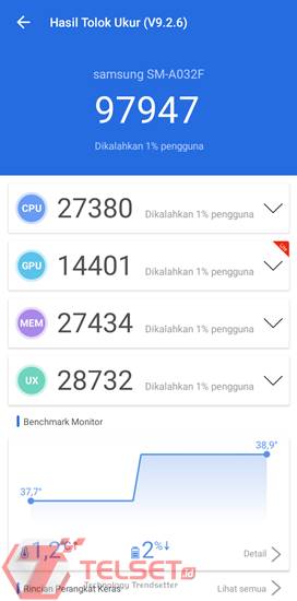 Dari pengujian menggunakan aplikasi AnTuTu Benchmark, HP terbaru Samsung ini mendapat skor 97.947 poin. Skor yang sesuai dengan tergolong bagus untuk HP entry-level sehingga cocok untuk dipakai browsing, streaming hingga bermain game.