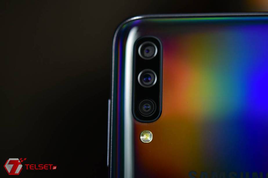 Di bagian belakang juga terdapat tiga kamera yang diposisikan secara vertikal, serta LED Flash. Tunggu, kemana sensor sidik jarinya? Well, Samsung menyisipkan sensor sidik jari di bawah layar Galaxy A70.
