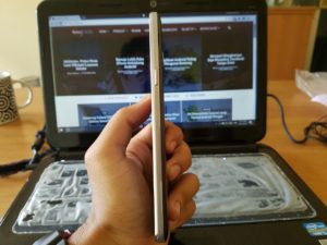 Galaxy On 7 juga tampak terlihat besar karena memiliki dimensi 151.8 x 77.5 x 8.2 mm dengan berat 172 gram. Dan ketika kami menggenggam smartphone berukuran layar 5.5 inch ini, kurang nyaman jika menggunakan satu tangan saja dan terasa sangat pas ketika menggunakannya dengan dua tangan.