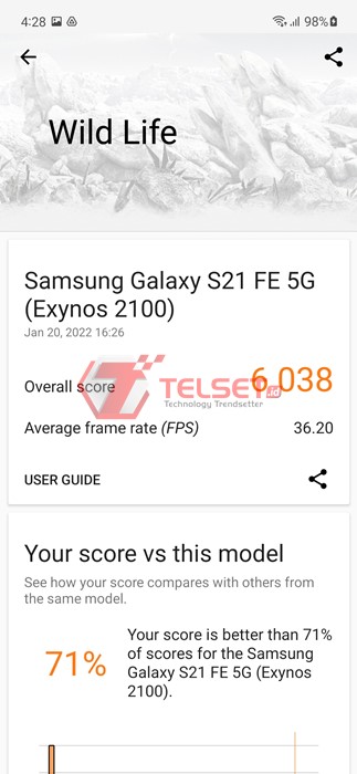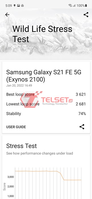 Di Wild Life Stress Test, spesifikasi Samsung Galaxy S21 FE 5G yang kami review mencetak skor terbaik 3.621 poin dengan skor terendahnya berada di angka 2.681 poin.