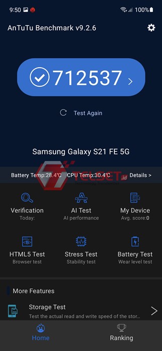 Dari pengujian menggunakan AnTuTu Benchmark versi 9.2.6, spesifikasi Samsung Galaxy S21 FE 5G mencatatkan nilai yang tinggi mencapai 712 ribuan poin. Dilihat dari skornya, smartphone ini berada di antara Snapdragon 888 dan Snapdragon 870.