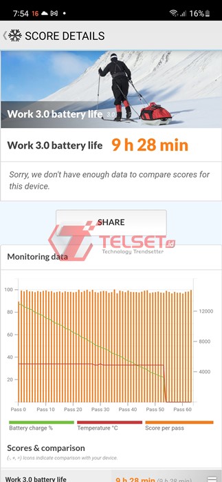 Berdasarkan tes yang kami lakukan menggunakan PCMark Battery Test, smartphone ini bertahan selama 9 jam 28 menit dengan baterai tersisa 16%. Sementara untuk memutar YouTube, dibutuhkan waktu 14 jam 4 menit dan 35 detik sampai baterainya 0%.