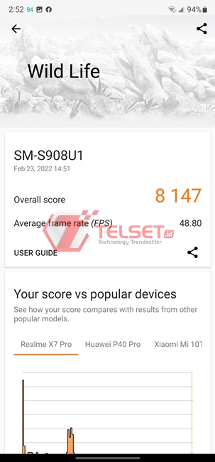 Sementara untuk Wild Life Stress Test, skor benchmark terbaik yang diperoleh Samsung Galaxy S22 Ultra adalah 7.745 poin dengan poin terendahnya hanya 4.366 poin saja.