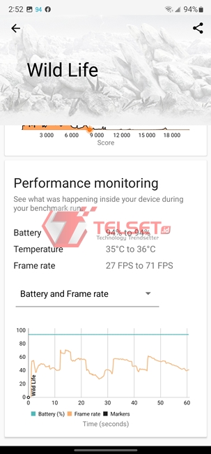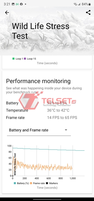 Sementara untuk pengujian GPU, kami menggunakan aplikasi 3DMark. Berdasarkan tes Wild Life, smartphone ini memperoleh skor 8.147 poin dengan rata-rata frame rate 48,8 FPS. Frame rate terendahnya berada di level 27 FPS, sementara tertinggi ada di titik 71 FPS