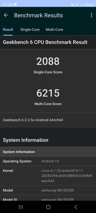 Di pengujian Geekbench, Galaxy S24 Ultra berhasil mendapatkan skor 2.088 untuk single-core dan 6.215 poin. Skornya termasuk cukup tinggi yang menggambarkan performa dari CPU perangkat ini.