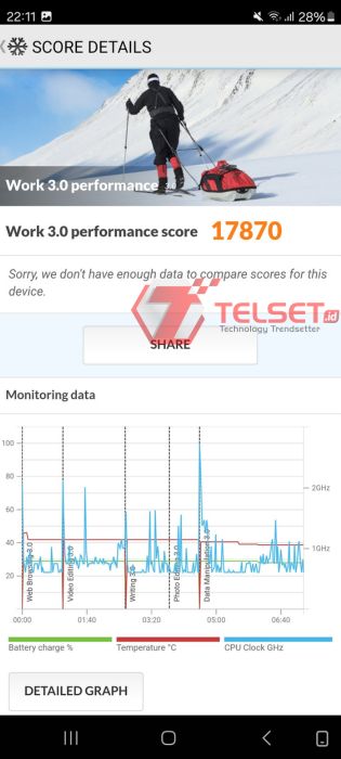 Untuk pengujian PCMark Work 3.0 Perfomance, ponsel ini memiliki skor di angka 17.870 poin. Dari hasil ini menunjukan smartphone ini bisa menangani aplikasi harian untuk pekerjaan sehari-hari mulai dari browsing, mengetik, hingga rendering video.