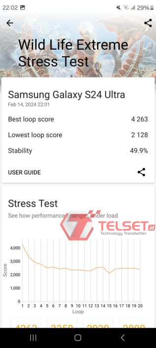 - Wild Life Stress Test: skor tertinggi 4263 poin dengan tingkat kestabilan 49,99%