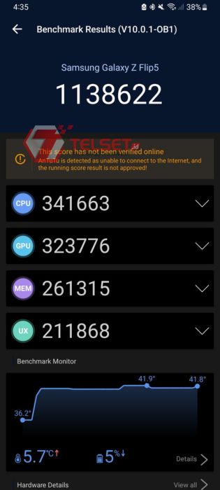 Untuk AnTuTu Benchmark, Galaxy Z Flip5 ini mampu menembus hingga 1.138.622, yang mana ini menunjukan bahwa performa ponsel dapat dimanfaatkan untuk berbagai tugas, baik itu tugas ringan hingga yang berat sekali pun.
