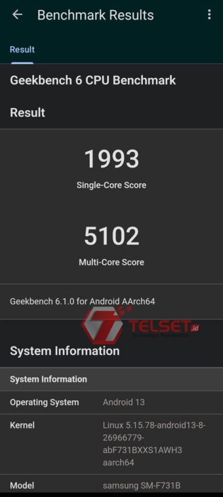 Dalam pengujian Geekbench 6, CPU perangkat ini berhasil mendapatkan skor 1993 untuk single-core, sedangkan multi-core menghasilkan skor 5102. Dari pengujian ini bisa disimpulkan bahwa kualitas CPU perangkat mampu memberikan performa yang tergolong baik.