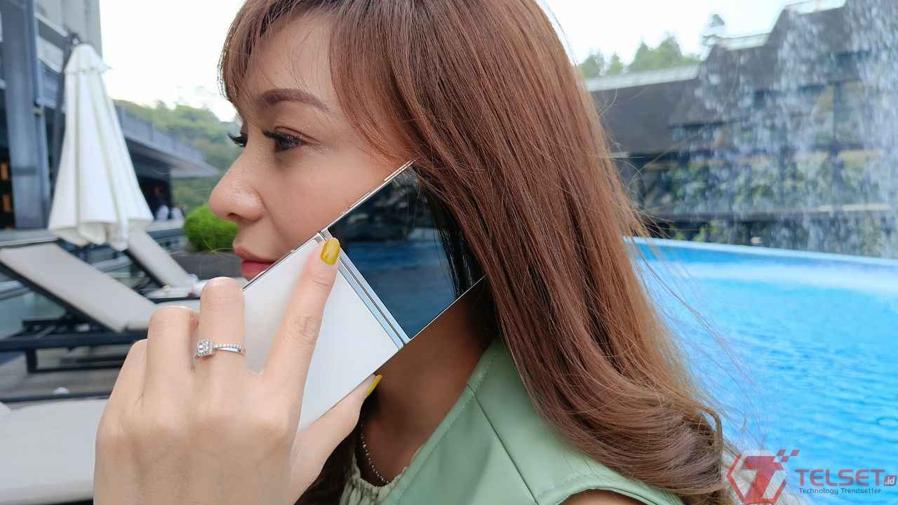 Namun, untuk kondisi layar di lipat, ponsel ini terasa cukup nyaman. Penggunaan satu tangan pun sangat oke, bahkan jika di pegang menggunakan dua tangan saya ponsel ini terasa sangat kecil.